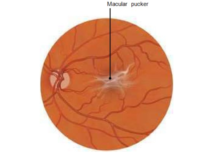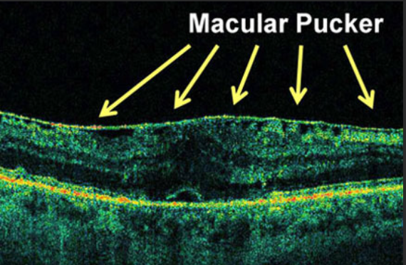 A macular pucker, also known as an epiretinal membrane (ERM), is a thin layer of scar tissue that forms on the surface of the retina, specifically over the macula. The macula is the central part of the retina responsible for sharp, detailed vision needed for activities like reading, driving, and recognizing faces.